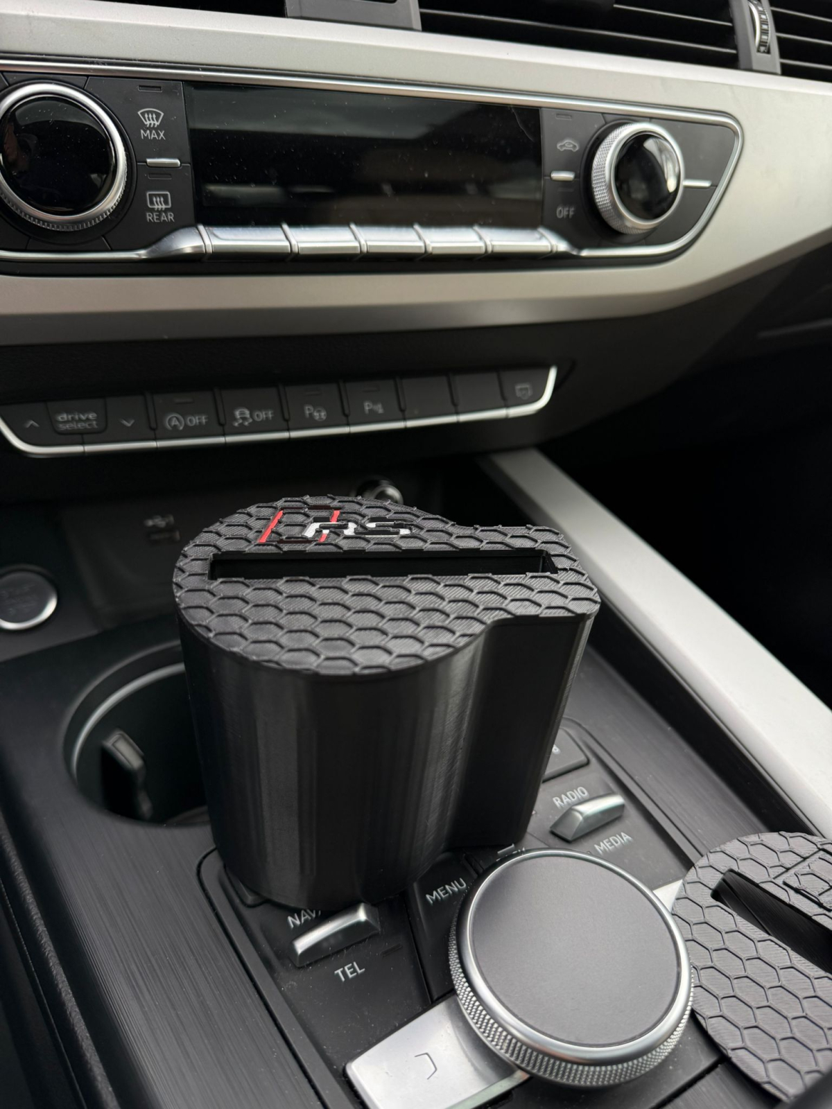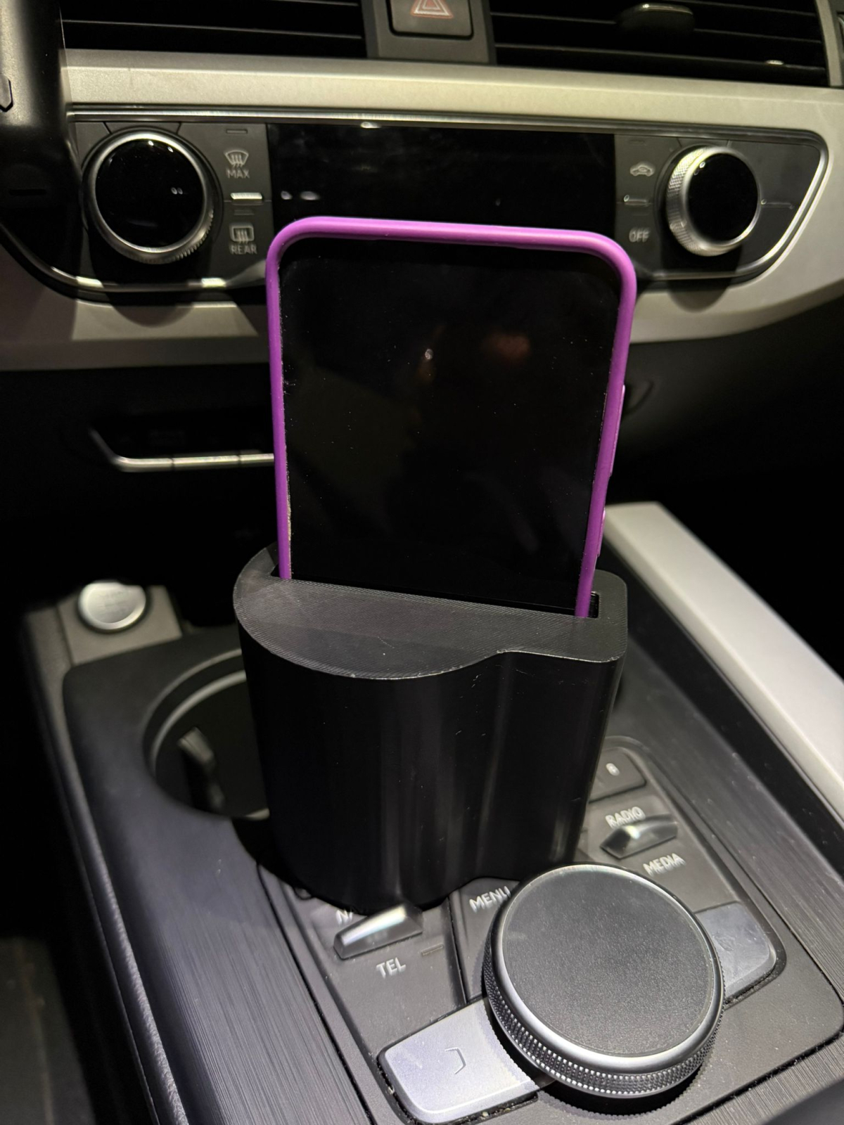 Este un suport telefon auto personalizat, realizat la comandă pentru anumite modele de mașini. Se montează în consola centrală sau în zona suportului de pahare și oferă un loc dedicat pentru telefon.